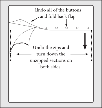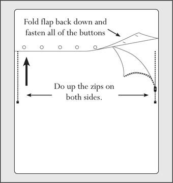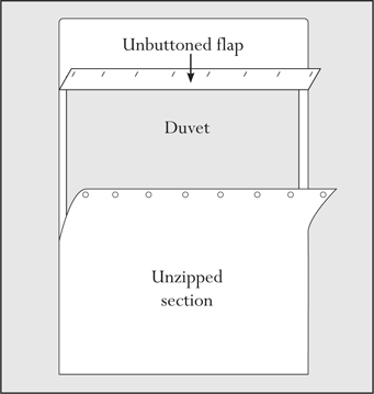 To fit a duvet, place your Duvelope® face up on the bed. Undo the buttons and unzip the two sides. Fold back the buttonholed flap and turn down the unzipped section on both sides.